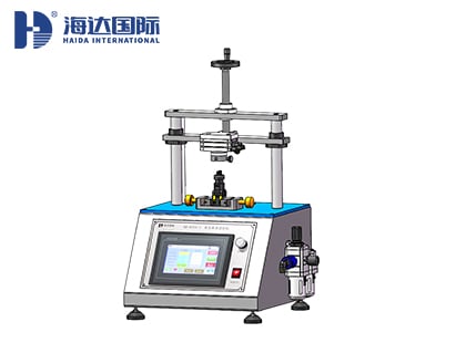 將樣品固定于本機夾具上(帶電測試樣品需要鎖緊快速插頭),扭緊螺桿把手使樣品固定。旋轉氣缸則在調好適當高度情況下,往復旋轉按鈕,直到樣品損壞,記錄點動次數。